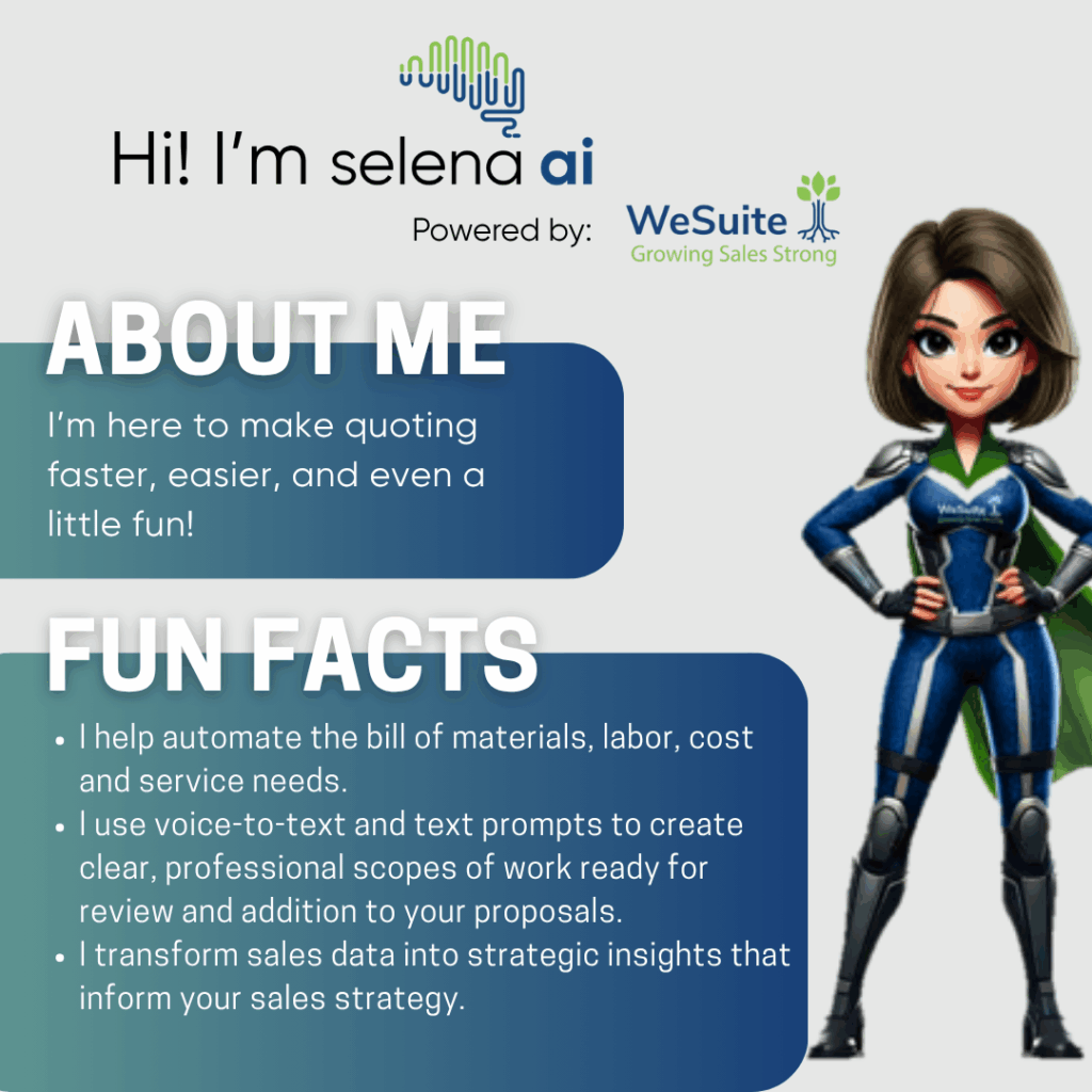 That’s where Selena, WeSuite’s new virtual sales assistant, steps in. She takes what you’ve already built in QuoteAnywhere or WeEstimate – the parts, the labor, and the system details – and turns it into a clear professional first draft Scope of Work. No more copying from old templates or staring at a blank page. Selena writes it for you, in plain language your customer will understand.